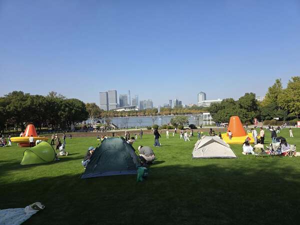 草坪上搭起一頂頂帳篷,市民利用周末,來與大自然親近,不少孩子歡快地騎著腳踏車。望著這一景象,不由地想:大概只有中上層的家庭,才有能力來這享有這份閒情?若是尋常人家,一週工作下來,多半已累扁。