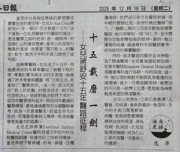 然而,女兒追求卓越醫術的腳步並未停歇,為了精進醫術,她隻身遠赴新加坡,在Singapore General Hospital著名醫院的乳房腫瘤專科,進行了為期一年的深造。