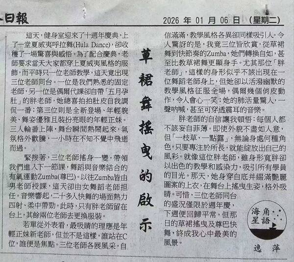 這天,健身室迎來了十週年慶典,令我因上了一堂夏威夷呼拉舞(Hula Dance)而收穫了一場驚喜與感悟。為了配合慶祝,老師要求當天大家穿上夏威夷風的服裝,而平時只有一位老師的課堂,這天竟出現了三位老師同臺教學。