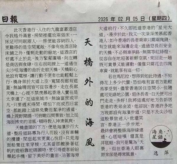 漫步於此,我又一次深深羨慕起香港人:如今香港的長者,乘車只需兩元,有空就能來海邊走走。通過悠長而安全的天橋,不必與車爭路、無需等紅綠燈,從容自在地迎著新鮮空氣,來回走一趟既可賞景又能運動。僅僅只需花去四塊車資,就能享有這一切。