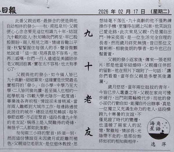 當年兩人離鄉到大城市工作,每逢路過彼此居住的城市,總設法相見暢談;每年春節返鄉,亦必定聚首。這段長達九十年的情誼,在當今世間堪稱絕無僅有,無怪乎二人如此激動。