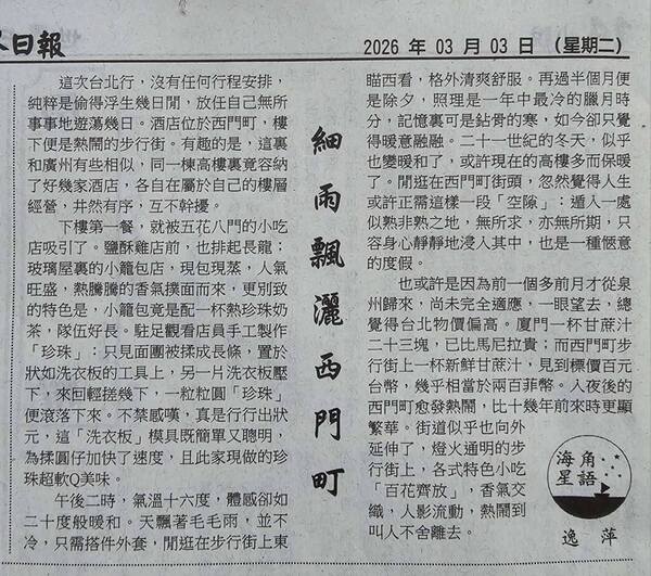 閑逛在西門町街頭,忽然覺得人生或許正需這樣一段「空隙」:遁入一處似熟非熟之地,無所求,亦無所期,只容身心靜靜地浸入其中,也是一種愜意的度假。時