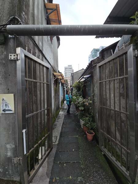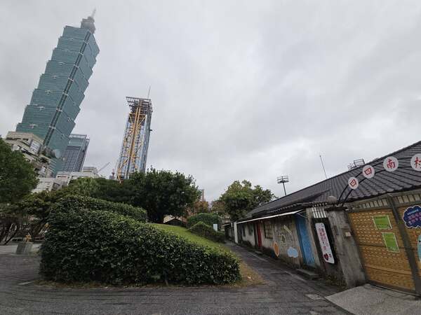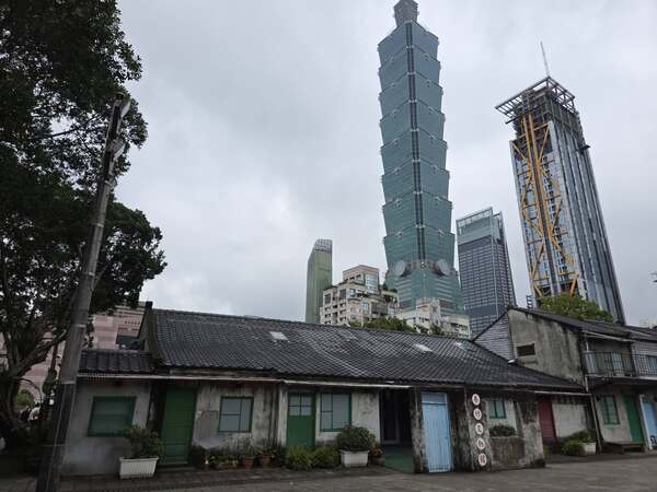 在臺北鬧市,入口處幾塊斑駁的門牌依稀可見「四四南村」幾個字,這裏還保留著幾排年代久遠的灰色矮小平房,也有簡單的二層簡陋樓房,每排矮小平房相距的空間還算大,邊上還有個綠色小公園及小山坡。