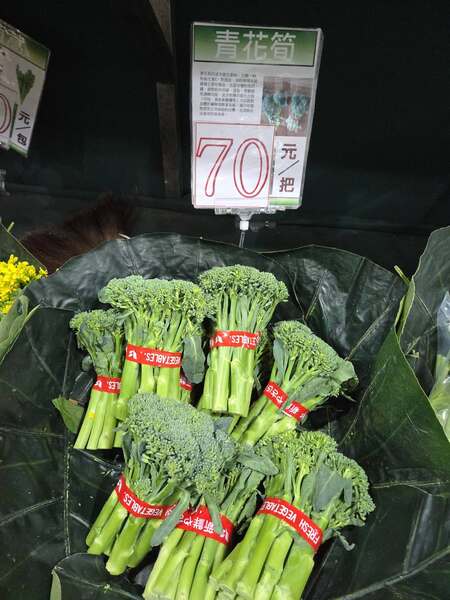 首次見到芥蘭菜只賣剪下的菜心,叫芥蘭苗,這也太奢華了;還有一種仿如芥蘭苗的蔬菜叫「青花筍」,名字中有個筍字,卻不是筍而是蔬菜,是芥藍與青花菜「聯姻」後的品種,細枝梗就像是芥蘭的梗,小花球長在最頂端.