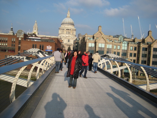 千禧橋和倫敦眼都是倫敦為慶祝千禧年而建的紀念景點。邁步在新穎的步行千禧橋上,尤其沒了車輛來往的喧嘩聲,顯得更悠游自在,慢慢渡步、俯視滔滔江水及川流不息的船只,欣賞河上雙邊的綺麗風景,自然使人賞心悅目而流連忘返,感嘆著倫敦怎麼有那么多的美景,就一條泰晤士河就有數不盡看不完的美景。