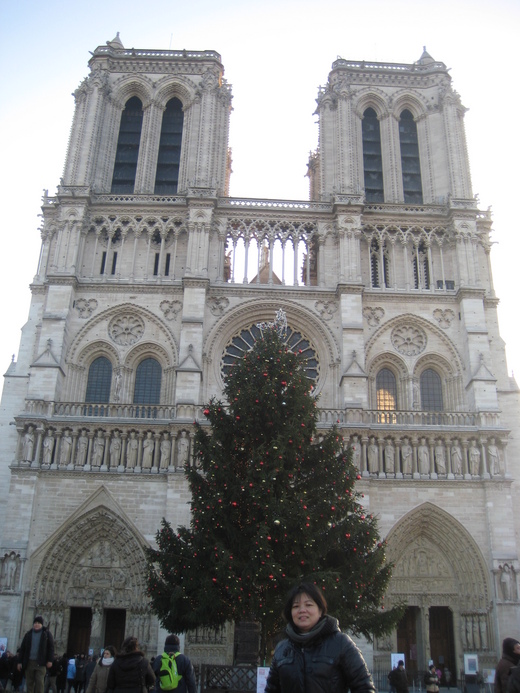 在大清早抵達巴黎聖母院。它建於一一六三年,據介紹歷時四百年才完工。坐落於塞納河畔,是一座雄偉莊嚴的歌德式的教堂,前面有一個大廣場。從外面仰望教堂,它的正面有一對鍾塔,高高矗立,在中庭的上方有一個高達百米的尖塔。最特別的是三個巨大內凹的石門洞,門的四周雕滿一尊一尊的小雕像,一層接著一層, 石像越往裡層越小,雕刻精細無比。