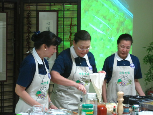 很幸運的每次在「心素食儀」總能見到烹飪的佼佼者來示範廚藝。第一節課是百忙中特意從台灣趕來的潭艾珍和洪若岑兩位師姐,她們可是素菜烹飪的高手,潭艾珍(阿母)更是常年在台灣主持素菜烹飪的電視節目;第二節課正迎來粽香飄逸的端午節,見到了包裹四五十年粽子,八十一歲身體健朗和藹可親的楊媽媽;第三節課是慈濟馬尼拉分會香積組的頭號人物,慈濟裡無人不曉無人不識的秀秀師姐,可以肯定慈濟人人都品賞過她親手烹飪的美味佳餚;第四節課是秀氣溫婉的韓國華僑王成方師姐示範做韓國名揚百國的傳統泡菜。