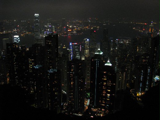 吃飽喝足後,我們到凌霄閣屋頂,看到的就是世界馳名的太平山頂夜景。原本讓我覺得壓迫感十足的高聳建築物,剎那間轉變成眨著數百萬顆燈火的超級豪華夜景,萬家燈火已不足以形容,遠眺維多利亞港和九龍海景,真是美呆了。
