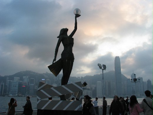 從南ㄚ島回到中環後,我們搭乘地鐵來到尖沙嘴的海濱長廊上的星光大道,對岸的中環摩天大樓群豎立在眼前,與之前太平山頂的「遠觀」、以及中環碼頭的「近看」比較起來,在天色將暗未暗之際,香港電影金像獎雕塑駐立在眼前,此刻的維多利亞港別有一番風味。