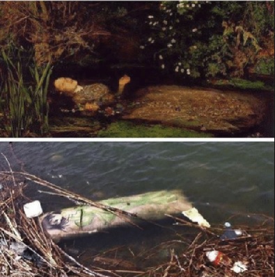 下面上圖是19世紀英國畫家米萊(John Everett Millais )的《Ophelia》,下圖看似一個漂浮在水上印有漫畫美女的充氣包.