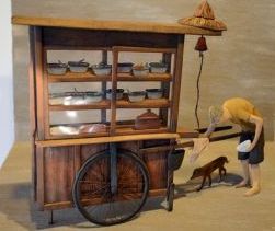 我因 Japanese Breakfast 這個名詞想起小時候早上常有一個小販用手拉車沿街賣早餐配稀飯的各式各樣日式醬菜, 小碗小盤分三層擺好, 停下來做生意時就搖幾聲掛著的銅鈴, 噹噹噹的通告附近居民, 顧客們拿自家的碗盤上前指指點點, 這個要一些那個要一點, 如今想起仍然回味 (那個年代台北人的日常生活情趣, 不是食味) 無窮, 網路上雖有不少圖片但是符合我記憶的只有一兩張, 選一張附於下.