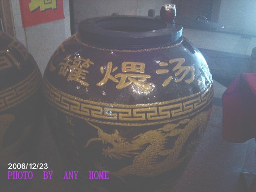 瓦罐煨湯,才走進餐廳大門,就看到比大水缸還大的瓦罐,內裝慢火煨8小時小缽原盅原味雞湯,雖知名產,無奈還要自掏腰包,而且馬上就有一桌大餐等著我們,說實在也吃不下,居然無人捧場。