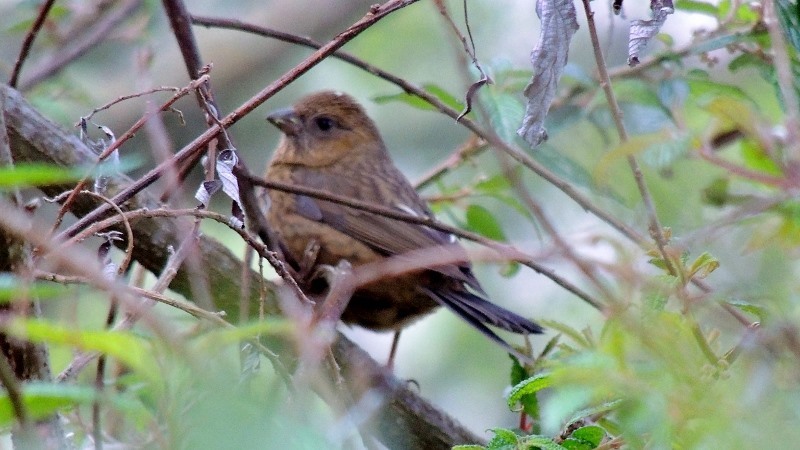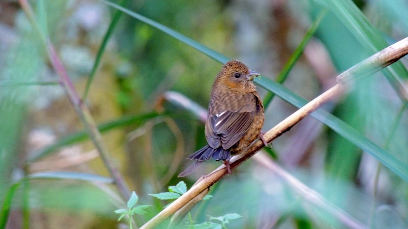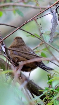 酒紅朱雀-母Taiwan Rosefinch,雄鳥全身有如紅酒般暗紅色的身體,白色眉斑,尾巴及翅膀為黑褐色。但雌鳥全身則為暗褐色且有黑色縱斑,與雄鳥比較,有如灰姑娘。