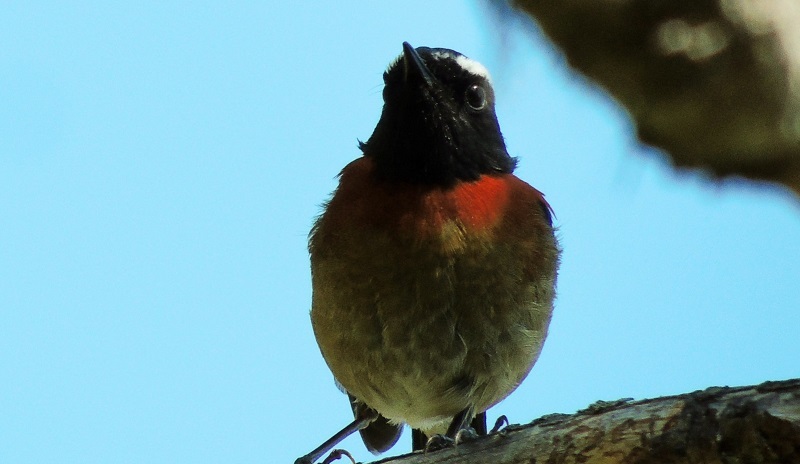 栗背林鴝-公,有兩道長白眉,黑喉下鑲著明亮的橘紅色橫帶,有如戴著橘紅色的領巾。