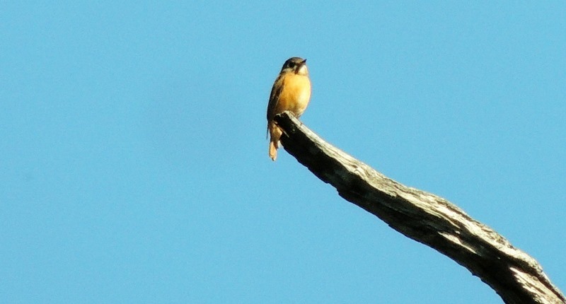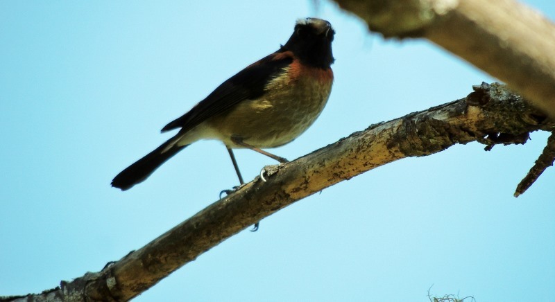 站立在夫妻樹最高點的紅尾鶲Ferruginous Flycatcher,全長約13cm,喙短先端尖細,食性以昆蟲植物種子及果實為主食;多單獨活動,停棲時大多身體挺直,常棲息於樹林冠木叢、草叢地帶或其附近之林緣地帶,築巢建築物岩石縫或樹上灌木叢中,雛鳥為晚熟性。 ↓↓↓