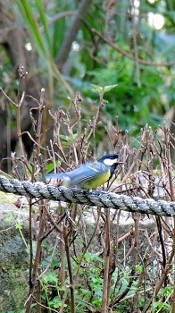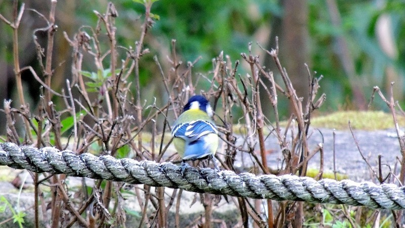青背山雀Green-backed Tit,身長12cm,黑色頭頸,左右臉頰上的白斑,體下腹中央有黑色縱帶為其主要特徵,雌鳥之黑色縱帶較窄。頭部除臉頰、耳羽和後頸有白斑外,其餘皆為黑色且帶藍色光澤。背黃綠色,腰及尾上覆羽為灰色,翼黑褐色,各羽外緣為藍色,覆羽上有兩條白色橫紋;尾羽黑色,羽緣藍色。腹面深黃色,嘴黑色,腳鉛色。 ↓↓↓