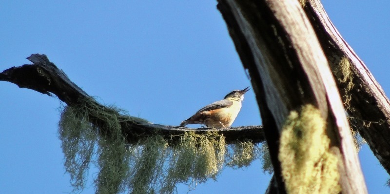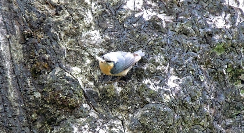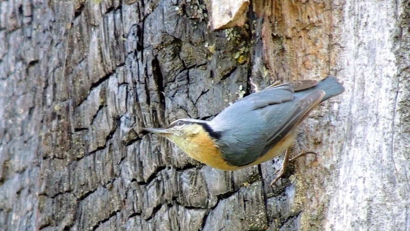 茶腹鳲 Eurasian Nuthatch,全身長約12cm。頭頂、背為藍灰色,臉、喉及胸、腹為栗褐色。有明顯黑色過眼線。尾短,尾羽末端白色、腳灰黃色,爪能深入樹皮。棲息於中、高海拔之樹林上層。普遍之留鳥。以樹皮裂縫中的昆蟲為食,常成小群於樹幹上攀爬覓食。 ↓↓↓