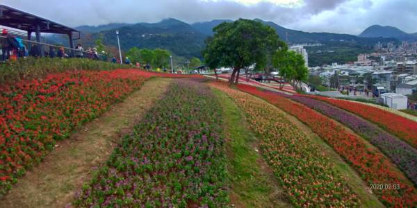 下車就在馬路對面斜坡上,從路邊一朵花都看不到,但是你若直接爬上樓梯,或者順著斜坡無障礙步道走上去,七彩繽紛、琳瑯滿目的花海會讓人目不暇己、目瞪口呆,數大便是美,無論你從哪個角度拍都漂亮,背景青山入鏡又更有立體感,再換個角度,山下高樓大廈也入鏡,更顯示出都市之美。