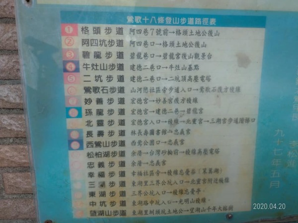 從廟前→孫龍步道→鶯歌石→鶯歌石步道,因為停車位置在廟前,必須原路折返,來回約2小時,無法環繞其他步道,改天較熟悉了再研究看看如何環繞串聯,或是從不同的登山口爬山,多走幾條幾條不同的步道。