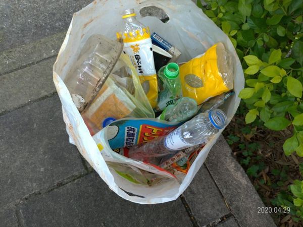 欸!戴上手套沿路撿垃圾,小袋子不夠裝,再撿個大袋子裝滿。