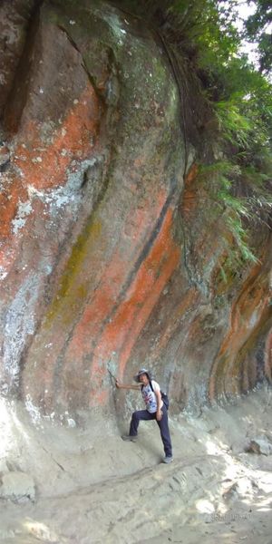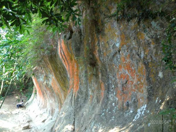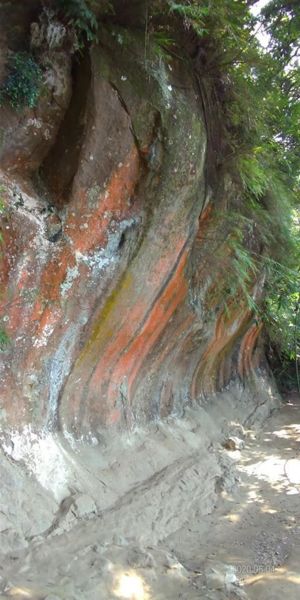 【鳶山彩色岩壁】∼千辛萬苦才爬上來,值得了。雖然不長,大約70公尺,岩層因所含成份不同,色彩繽紛,壯觀高大的弧形,真是大自然的巧奪天工,五顏六色為山林增添罕見景致。