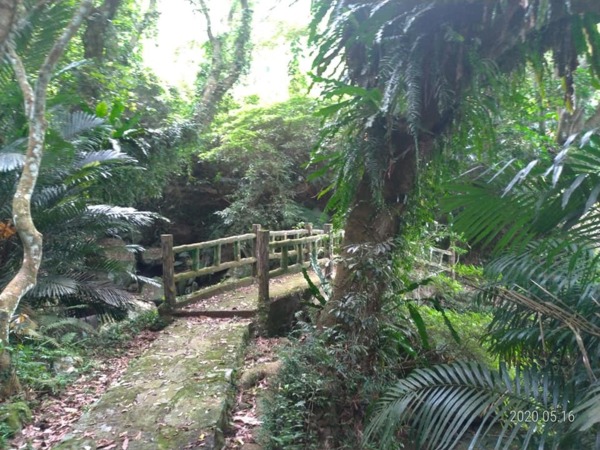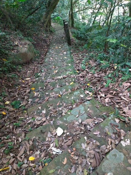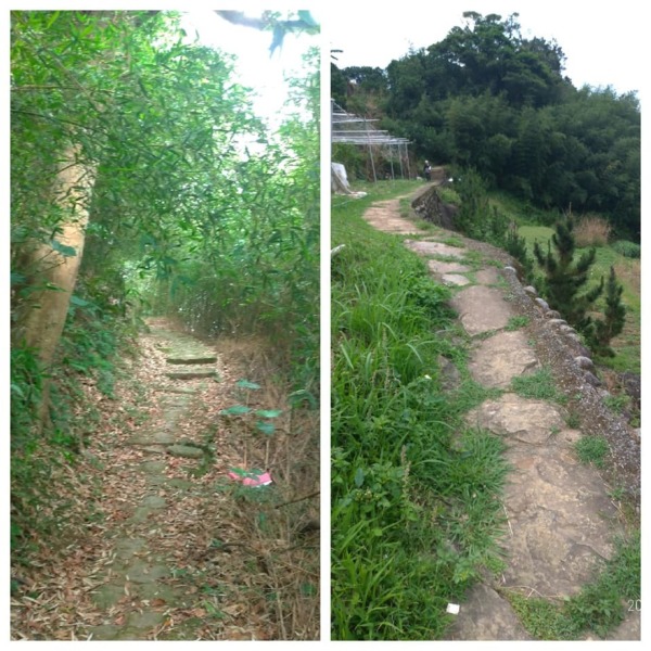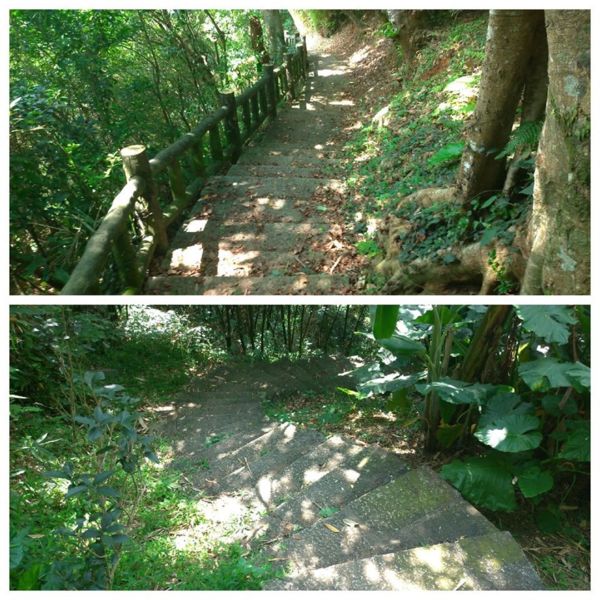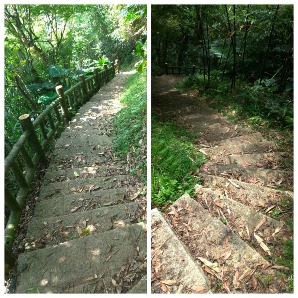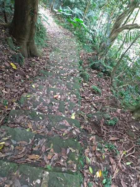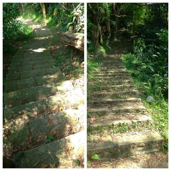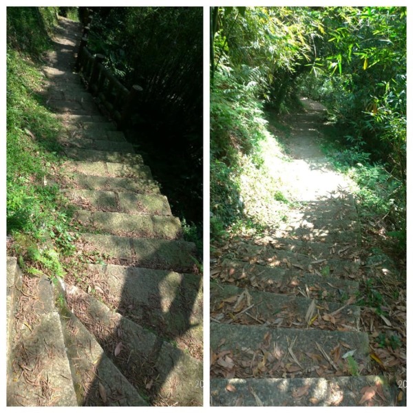 穿過巷弄走到底沒路了,完全沒有看到登山步道入口,左瞧右看總算看到指示牌,原來路在下面,走在一路下坡的花崗岩石步道,兩旁是相思樹林、竹林,五色鳥、小彎嘴畫眉不停的鳴唱,大冠鷲也不甘示弱,在空中盤旋宣示主權,還不錯吧!雖然曬不到太陽,可惜山凹裡沒有風,才走沒多久已經滿頭汗。