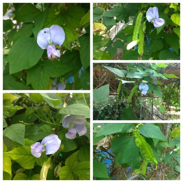 棚架上淡紫色的小花,果實細長,邊緣呈現鋸齒狀,是某種豆子嗎?