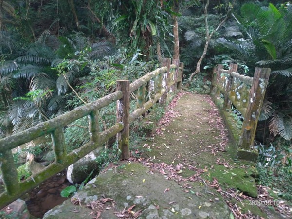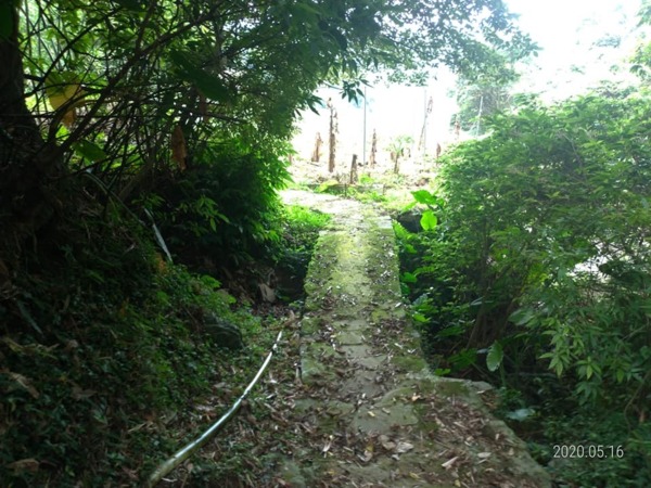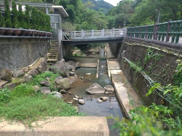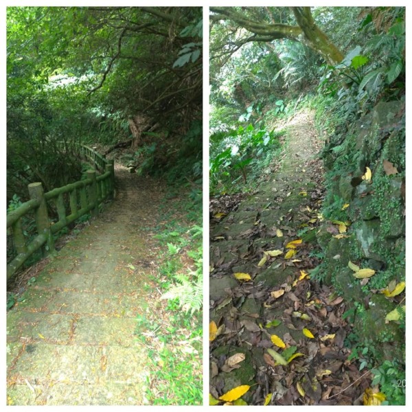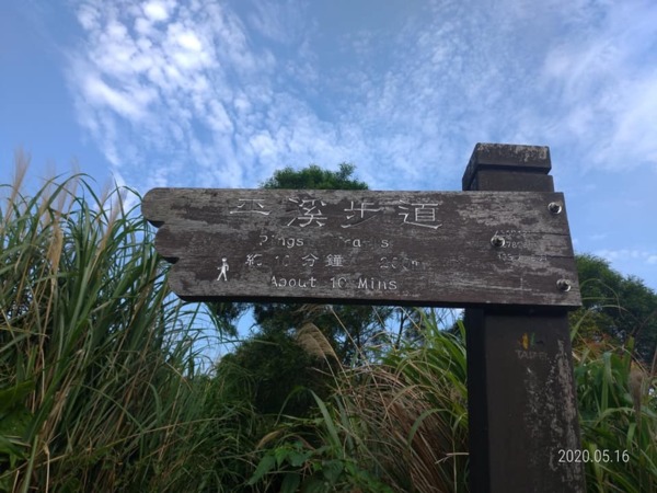 走出森林區步道到了一些住家,走50公尺柏油路面,右轉銜接【平溪步道】下山至善路的礁坑橋。一路下坡,從陽明山上走下士林內雙溪。