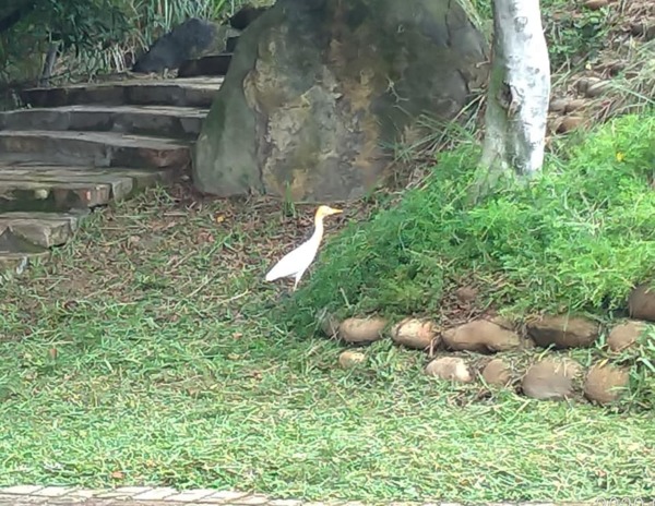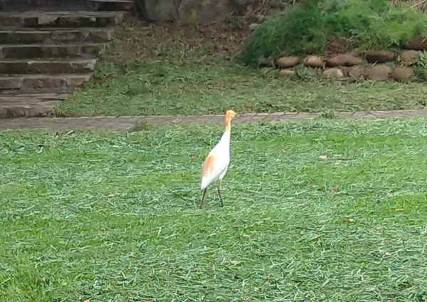 硫磺谷溫泉泡腳池前的草坪,剛割過草,引來幾隻又名牛背鷺的黃頭鷺,在草坪尋覓小昆蟲。↓↓↓