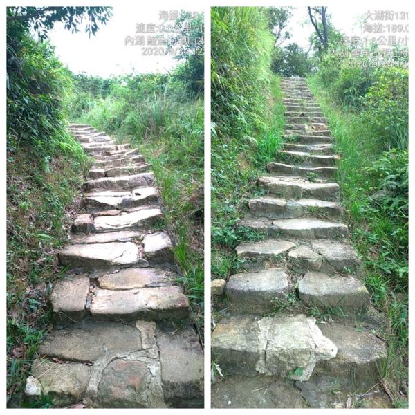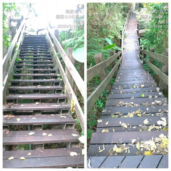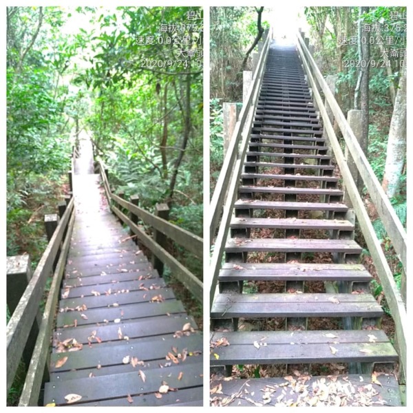 今天從【大崙尾山】爬到分叉路口想繼續爬【大崙頭山】,跟著2位遊客往【大崙頭山】方向走,她們只到碧山露營區,只好自己順著柏油路繼續走,看到路旁有木棧道階梯,這是捷徑。