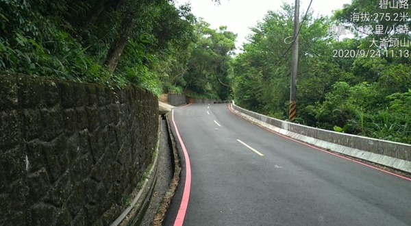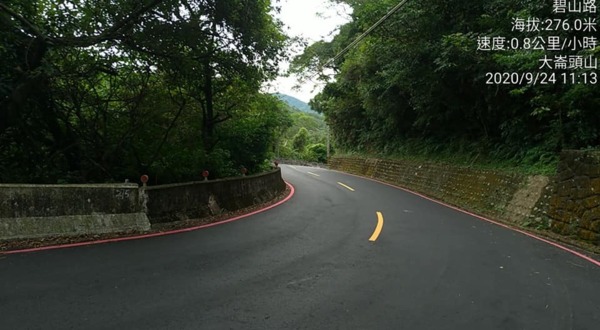 走下木棧道階梯,出現柏油馬路,問正在測量的帥哥:「請問下山往哪走?」