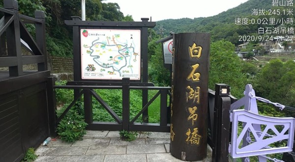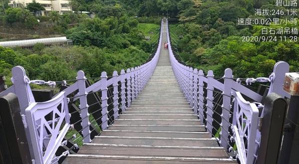 哈哈哈!順著柏油路下坡路段,才走不到30分鐘,就到了【碧山巖】的【白石湖吊橋】,我最愛的淡紫色。