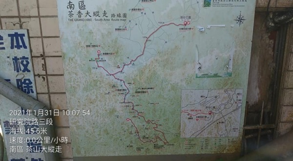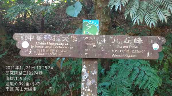 今天南縱走 茶香步道:從南港 中華科技大學登山口→茶香步道→南港山→九五峰→黃蟬園→虎山步道,含拍照、上傳FB、休息,約2.5小時。