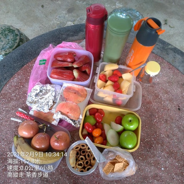 從登山口開始一路直上的石階,爬到第一個涼亭,暫緩休息一會兒,吃吃水果大餐。↓↓↓
