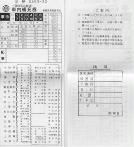 在東京搭乘小田急線,南下伊豆半島,約兩個多鐘頭就到箱根湯本,展開我們的溫泉之旅。在某個鄉間無人小站沒有自動售票機,於是上了車之後,我去找酷酷的列車長,然後拿紙條寫上:「塔之呎 > 大潼谷,X 2。」附上大鈔一張遞給列車售票員。(備註 : 站名的漢字我用注音符號打不出來,只能差不多的意思。)
