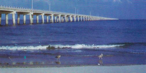 它建於距今四十多年前的1964年,費時三年半,花了二億美元,如果是現在的幣值,可不知道要多少倍了 ! 總長度有26英里,橋墩深入海平面下20-100英尺不等 ; 除了像一望無際長虹般的橋面,其中還包含了平常一般橋少見的2段海底隧道。