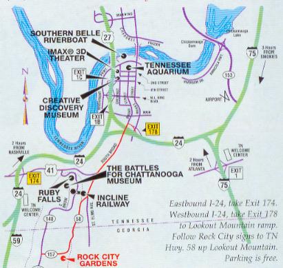 Carpets of moss , lush ferns , huge trees growing from boulders , and fromations sush as Needles Eye, Mushroom Rock , and Fat Man's Squeeze all exhibit the natural charm which has made Rock City Gardens a favorite for generations。