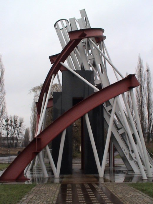 有一部份廠房及土地為了紀念當年的民主運動,劃撥作為民主紀念館和年輕人藝術創作區。一進入廠地,最先通過代表民主的鋼鐵雕塑,表現歷盡千辛萬苦、多少人前撲後繼,以鮮血和鋼鐵般的意志,不屈不撓堆砌出的民主閘門,再穿過代表波蘭經濟命脈的船首造型閘門,我不懂得此船首閘門如何設計的,走著走著好像真的站在大海中搖擺不定的舺板上,頭真的會昏呢 !