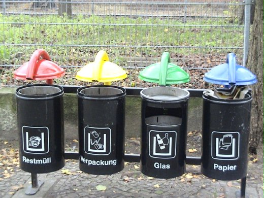 早已聽聞德國的垃圾分類、資源回收做的非常徹底。果然百聞不如一見,街頭巷尾處處可見一排四個小型垃圾桶,蓋子顏色不同,桶子上畫著報紙、玻璃瓶、金屬罐、塑膠類,一目了然,再怎麼偏僻的鄉下也有四個一組的垃圾桶,德國是個愛乾淨的國家,遛狗一定自備塑膠袋和小鏟子,決無「遍地黃金」,地上當然不見垃圾。