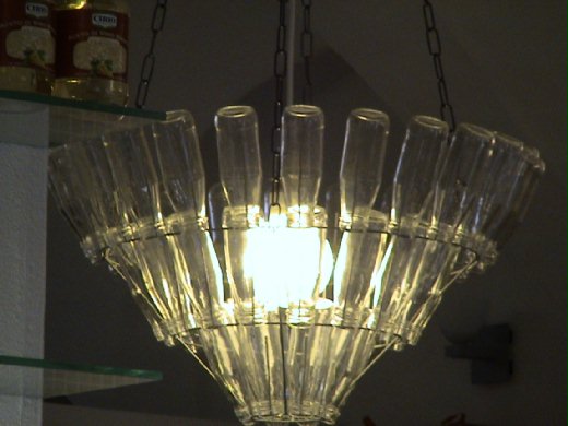 在小鎮Trausberg的一家小館子吃午餐,還發現一項資源回收的新用途,雖說是廢物利用,可也是非常漂亮:坐在吧臺的高腳椅,偶然抬頭看到閃爍的大吊燈,是數十個透明玻璃瓶組合成的,不但十分可愛,也可能是獨一無二的設計。