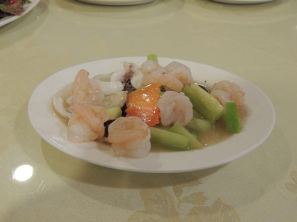 透抽+草蝦仁+香菇+扁扁的高纖維山菜(我沒吃過也不知道什麼名稱),大火快炒,搭配的色香味具全,超好吃。