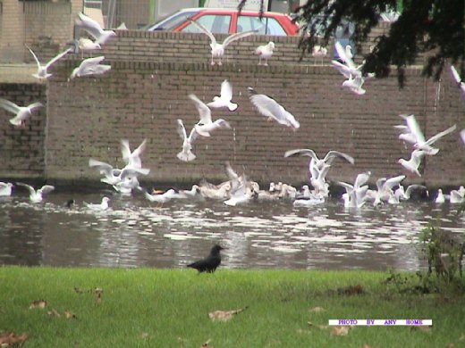 在這裡餵鳥要公平點,另一群潔白的海鷗就離的遠遠,默不作聲地瞧熱鬧,害我非得學棒球投手用力長傳,投大塊一點的麵包,否則牠們是搶不過雙雙對對的鴛鴦、水鴨,看那些海鷗「嘩啦啦」騰空展翅、飛起接殺,連用尖啄去啄食麵包的姿態,都優美地像副圖畫。