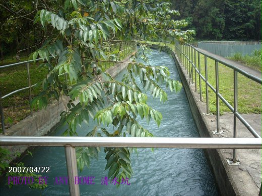 然後,一串串更大的驚嘆號,讓我的迷你相機忙得不可開交,路旁比路面還高的圳溝,清澈的耀眼,那麼漂亮的天藍色,就像大海的顏色,嘩啦啦的流著,漫步於菜園、蓮花池、小土地公廟、古老三合院紅瓦農舍……,能生活在這陶淵明筆下的世外桃花源,沒有福份恐怕還不行呢 ! 或許這就是桃園地名的由來吧 ! 我敢發誓 : 「清水坑的圳溝決對是全台灣最美。」