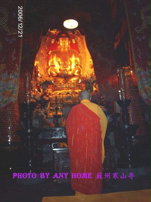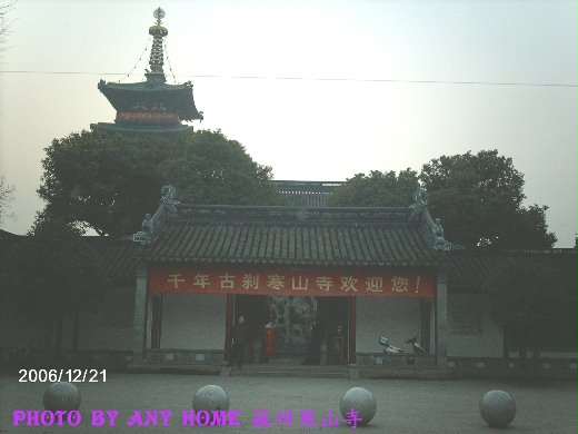 「寒山寺」建於南北朝時梁天監年 間(大約西元502年~519年),初名「妙利普明塔院」。相傳唐太宗時代高僧寒山、 拾得曾在這裡修行,所以更名「寒山寺」。寺曾經數次重建,現在的寺宇,為太平天國以後新建。寺鐘在第二次世界大戰時,被日本人運走,至八十年代中日交好後才獲送還。寒山寺每年都有一百二十多萬遊客參觀,絕大多數都是為尋找「夜半鐘聲到客船」的意境。(此段轉載自