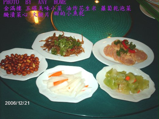 五碟美味小菜 : 油炸花生米、蘿蔔乾泡菜、醃漬菜心、火腿片、甜的小魚乾,清爽開胃,我學聰明了,先上的小菜集中一起合照。