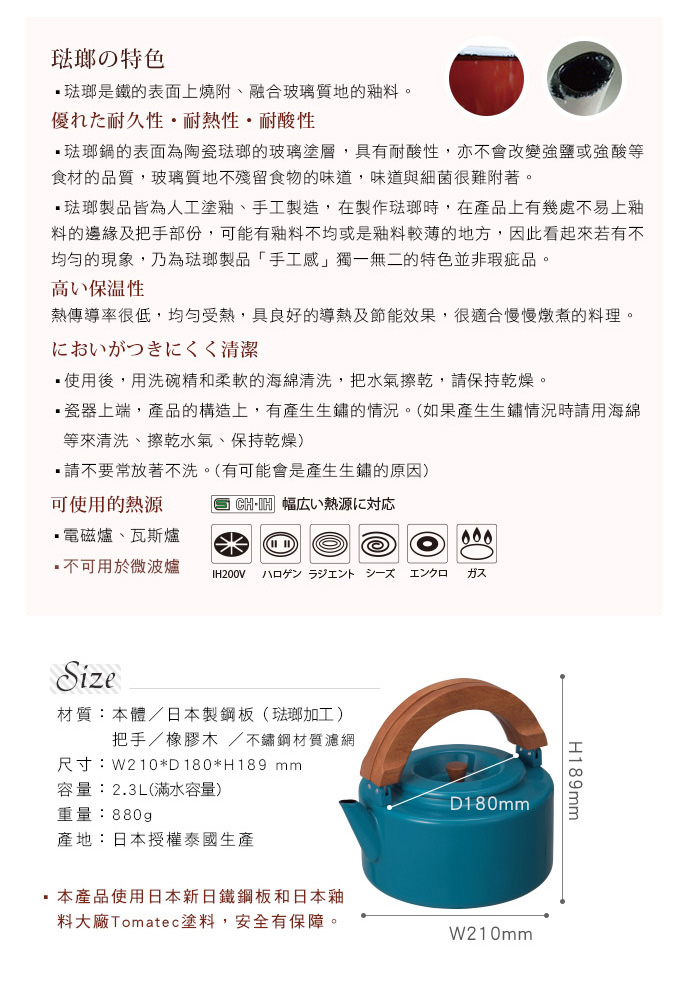 .琺瑯製質地輕巧,平滑不易沾黏
