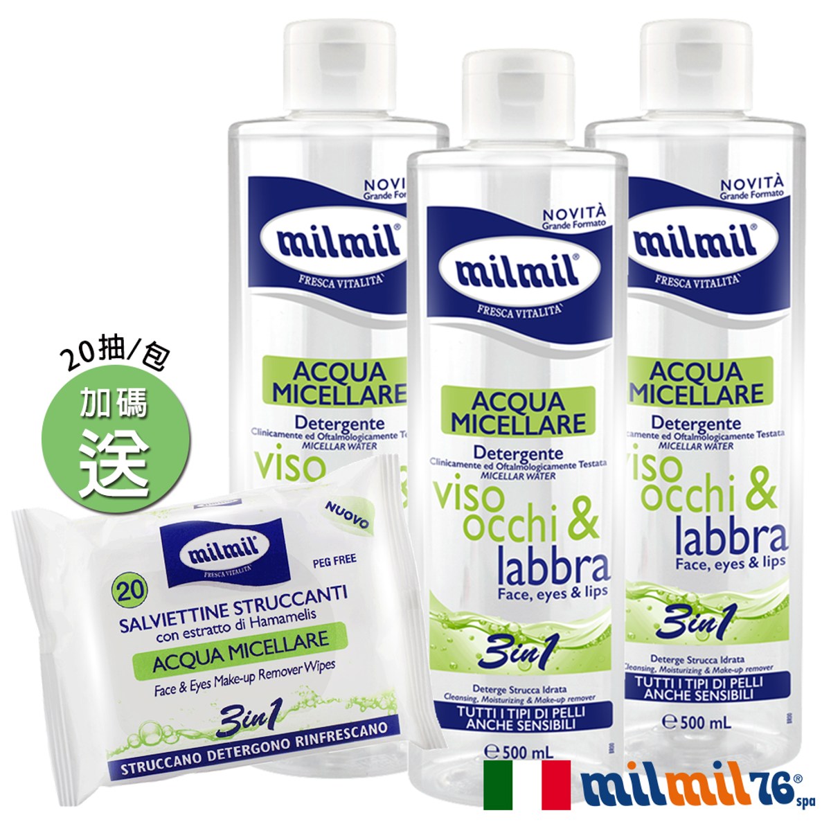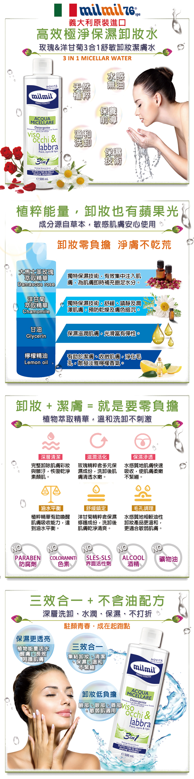 樂活【義大利MILMIL】玫瑰&洋甘菊3合1舒敏卸妝潔膚水3入(贈卸妝棉) - 016142598精心推薦-臉部清潔