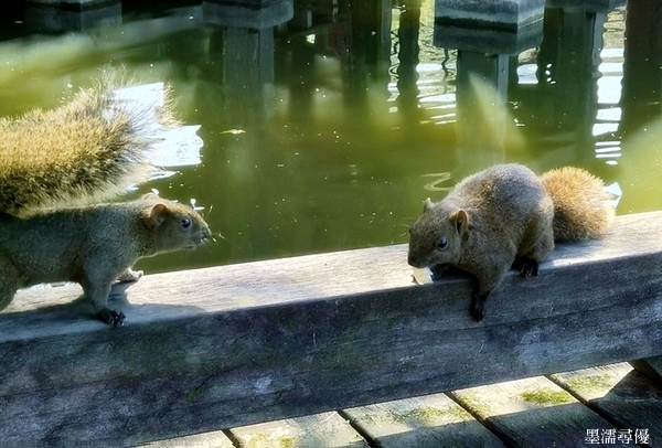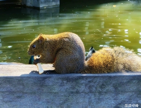 澤悅羽毛豐美。池中鴨戲依般。松鼠無憂無慮事。只貪頑。