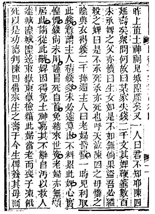 農夫陳四,夏夜在團焦守瓜田,遙見老柳樹下,隱隱有數人影,疑盜瓜者,假寐聽之。中一人曰:「不知陳四已睡未?」又一人曰:「陳四不過數日,即來從我輩游,何畏之有?昨上直土神祠,見城隍牒矣。」又一人曰:「君不知耶?陳四延壽矣。」眾問:「何故?」曰:「某家失錢二千文,其婢鞭捶數百未承。婢之父亦憤曰:『生女如是,不如無。倘果盜,吾必縊殺之。』婢曰:『是不承死,承亦死也。』呼天泣。陳四之母憐之,陰典衣得錢二千,捧還主人曰:『老婦昏憒,一時見利取此錢,意謂主人積錢多,未必遽算出。不料累此婢,心實惶愧。錢尚未用,謹冒死自首,免結來世冤。老婦亦無顏居此,請從此辭。』婢因得免。土神嘉其不辭自污以救人,達城隍。城隍達東嶽。東嶽檢籍,此婦當老而喪子,凍餓死。以是功德,判陳四借來生之壽於今生,俾養其母。爾昨下直,未知也。」陳四方竊憤母以盜錢見逐,至是乃釋然。後九年母死。葬事畢,無疾而逝。