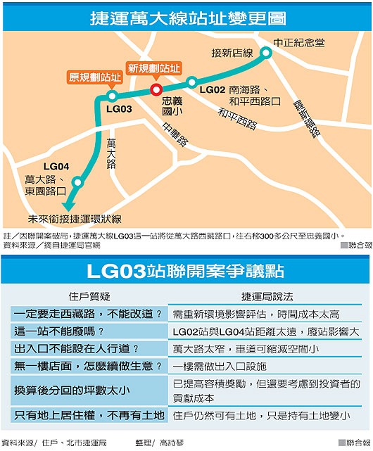 捷運萬大線原規劃在萬大路、西藏路口設LG03站,市府與居民溝通聯合開發兩年多破局,決定將車站搬至較遠的忠義國小。這是捷運營運以來,聯合開發破局導致捷運站搬家首例。